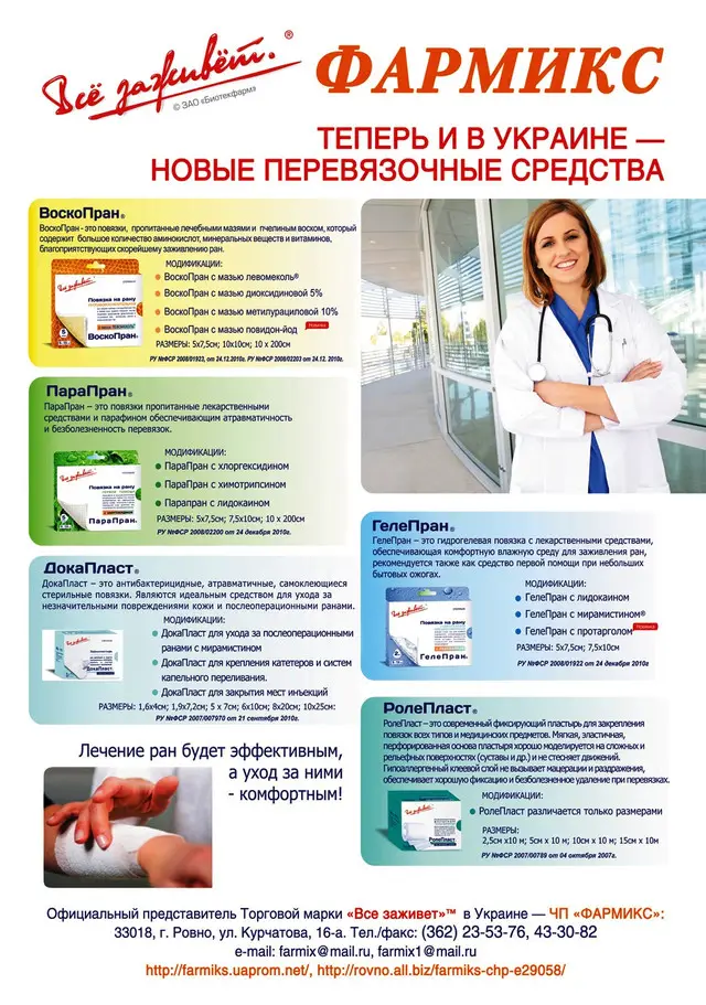 - Вироби медичного призначення (раневі покриття, пов'язки)