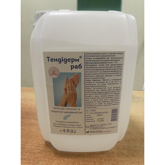 ТЕНДІДЕРМ® РАБ – високоефективний швидкодіючий засіб, що знижує кількість транзиторної мікрофлори шкіри за 30 с у 100 тисяч разів; ефективний проти резидентної мікрофлори шкіри; забезпечує пролонговану дію протягом 3 годин під медичними рукавичками; забезпечує антиперспірантну дію, зменшує кількість вологи під рукавичкою, що перешкоджає виділенню резидентної мікрофлори з глибоких шарів шкіри.